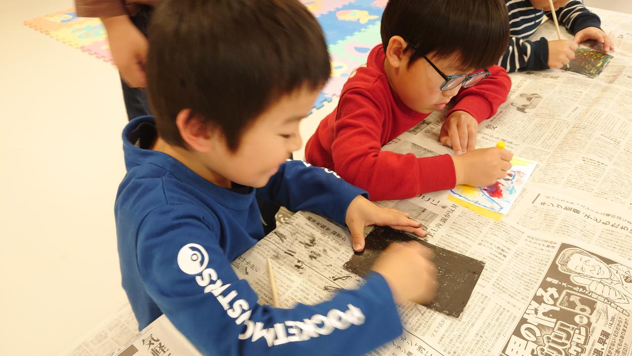 塗りつぶしたあとは、お箸でひっかいていきますよ~