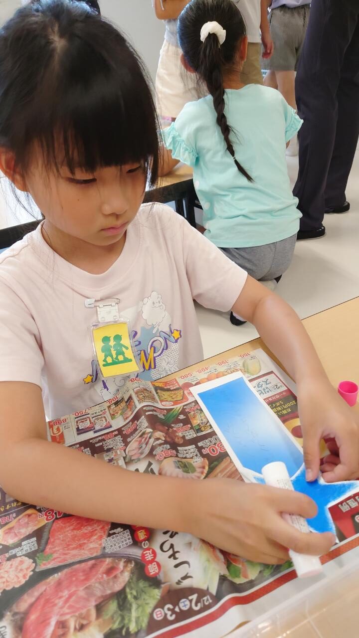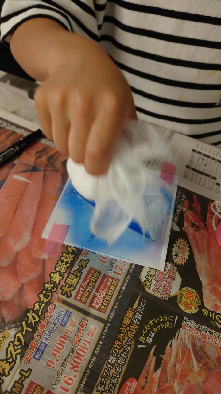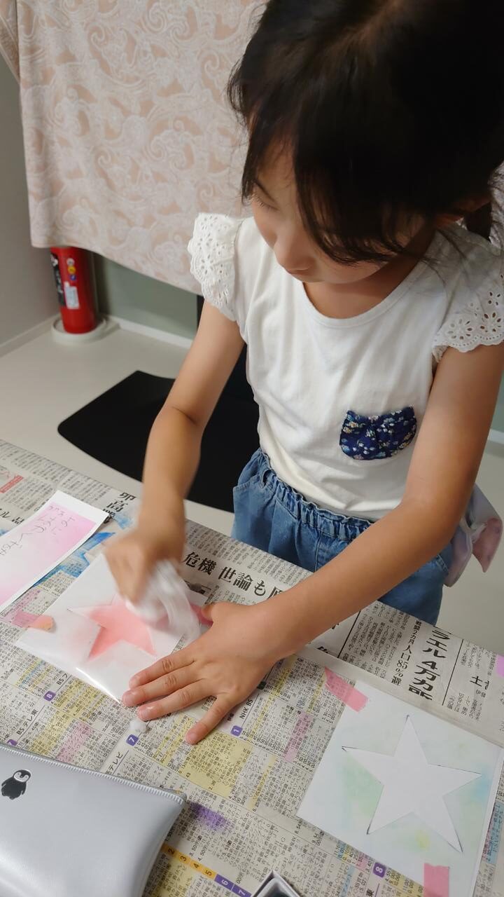 好きな色の絵の具でポンポンポンポン♪とってもきれいに星が浮かびあがりました✨