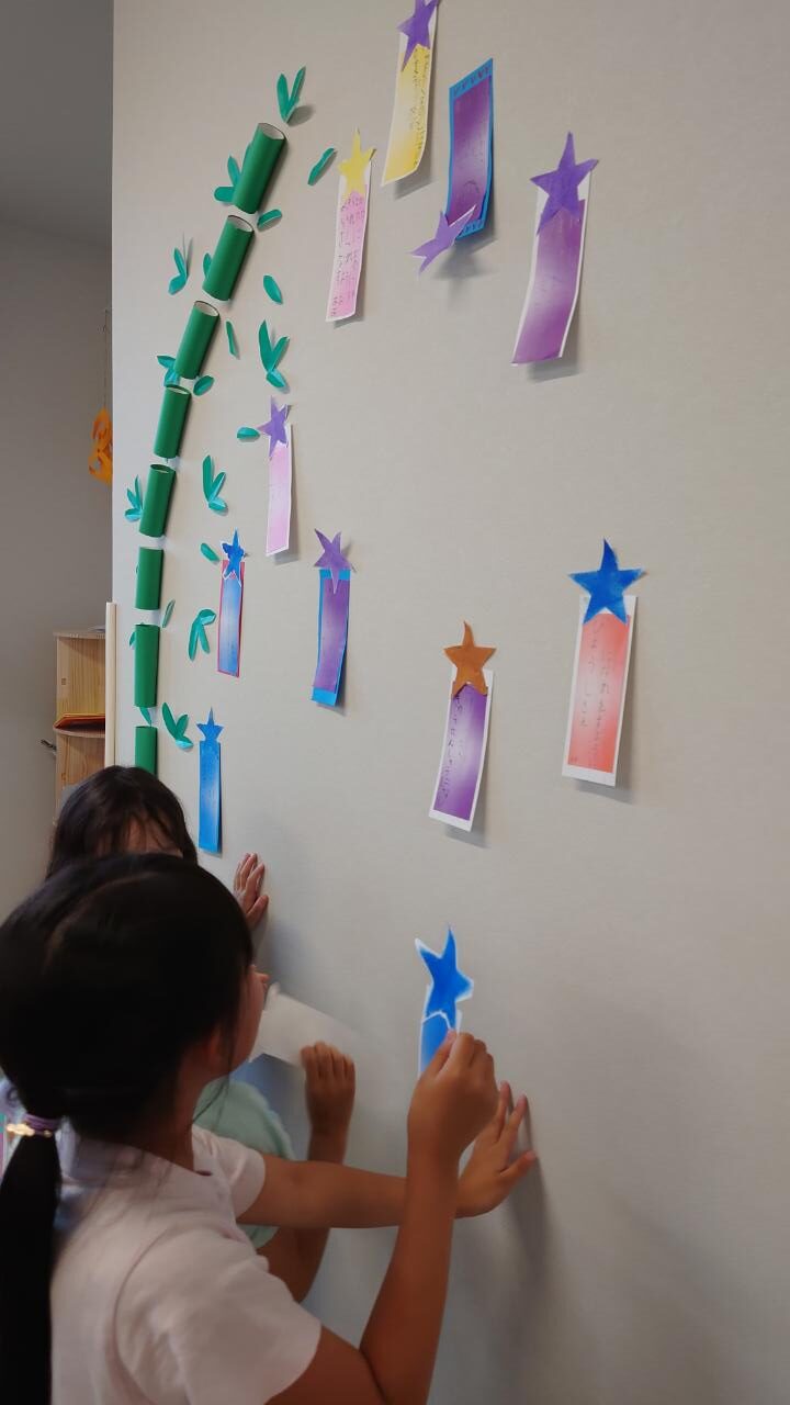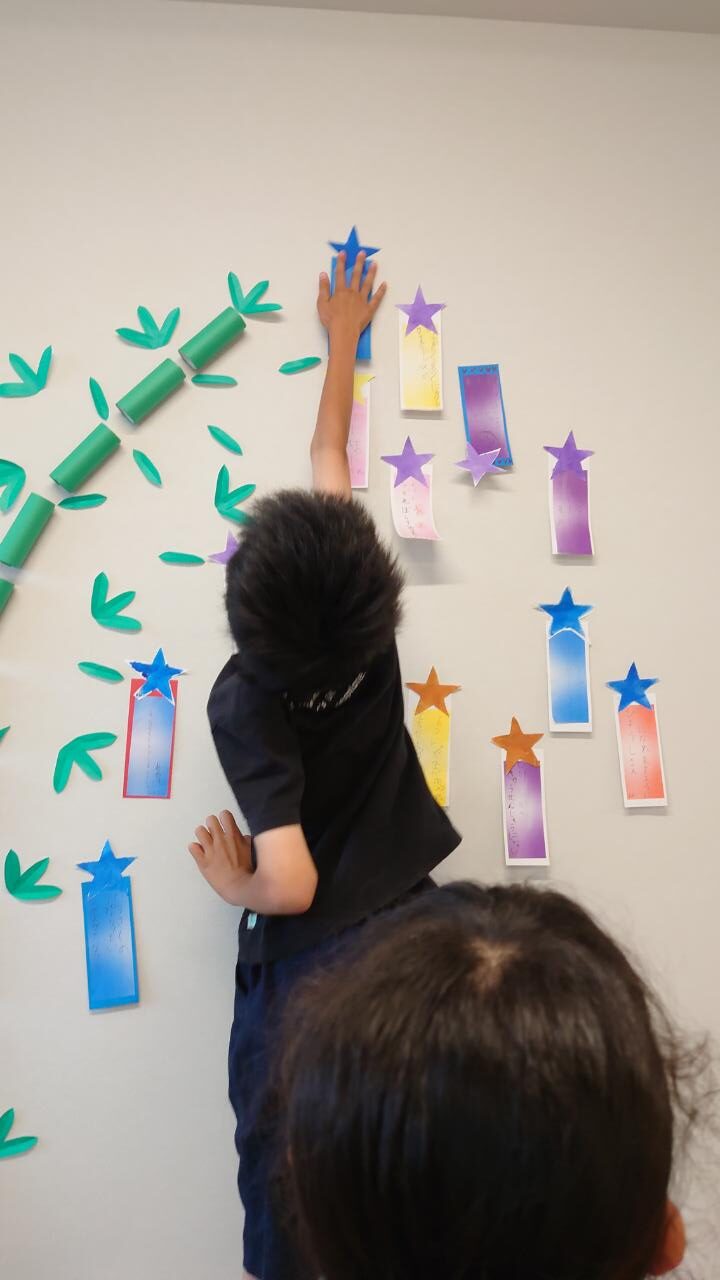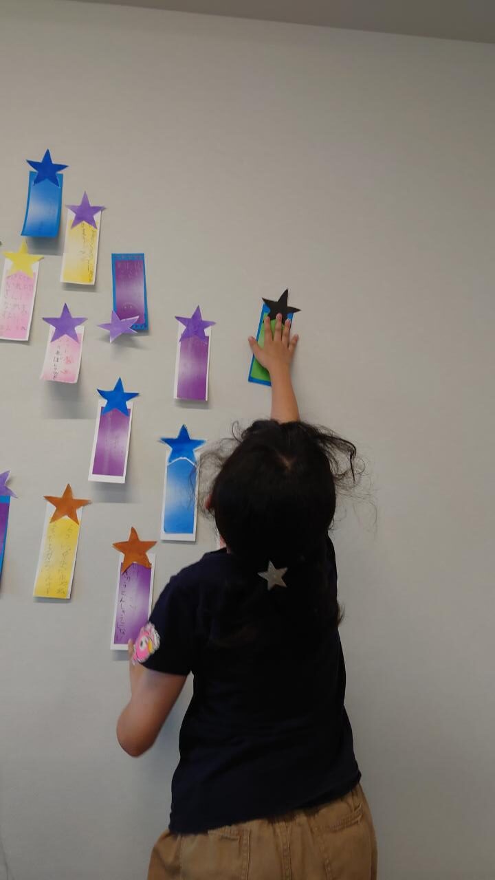完成した短冊は、子どもたちが自分で好きな場所に貼っていきます。