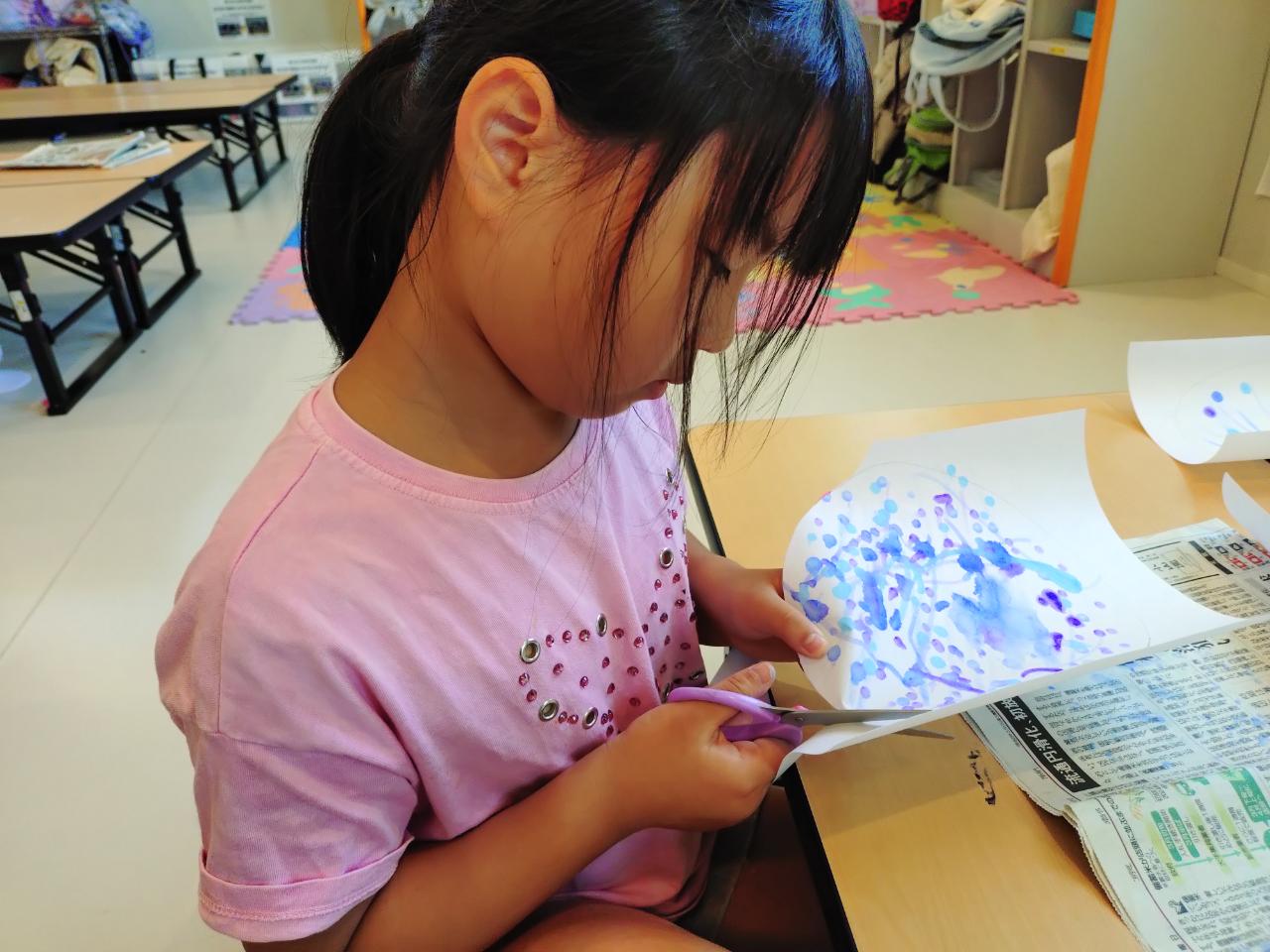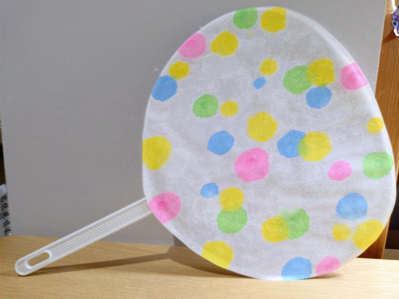 にじみ絵ができたら切って、うちわに貼ったら完成です👍