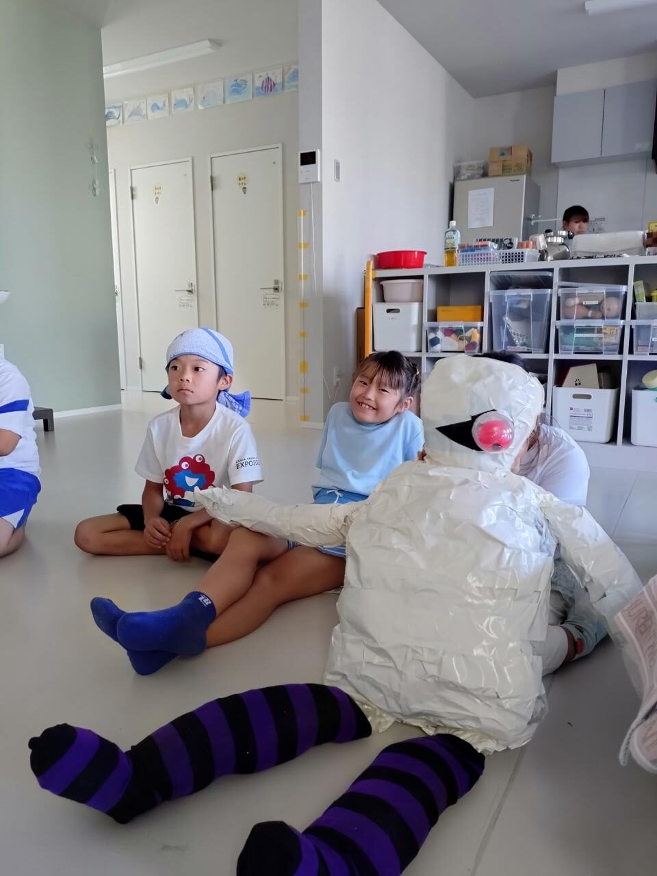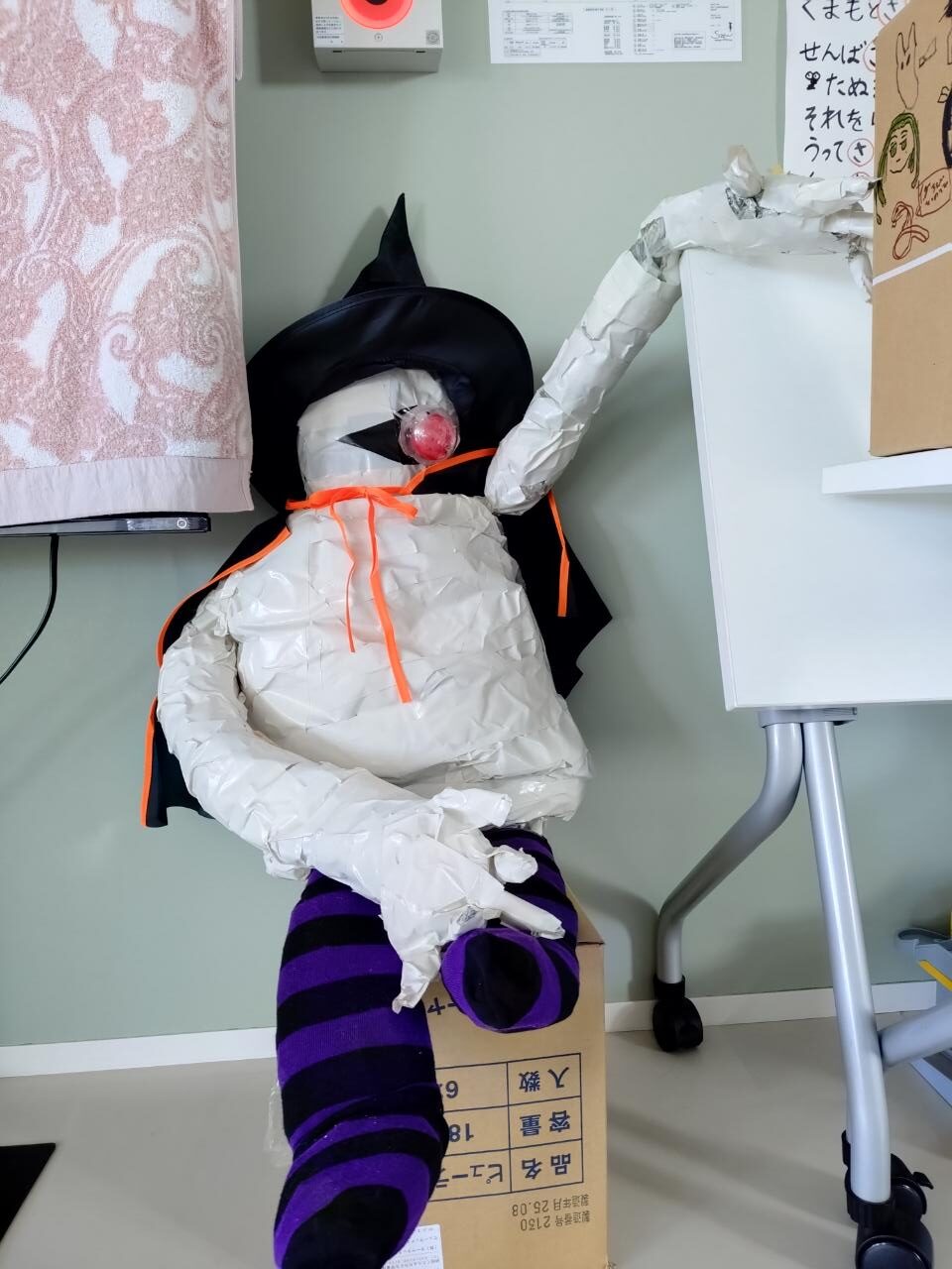 2年生と同じくらいの等身大ミイラ君(左)。みんなにかわいがってもらっています😊